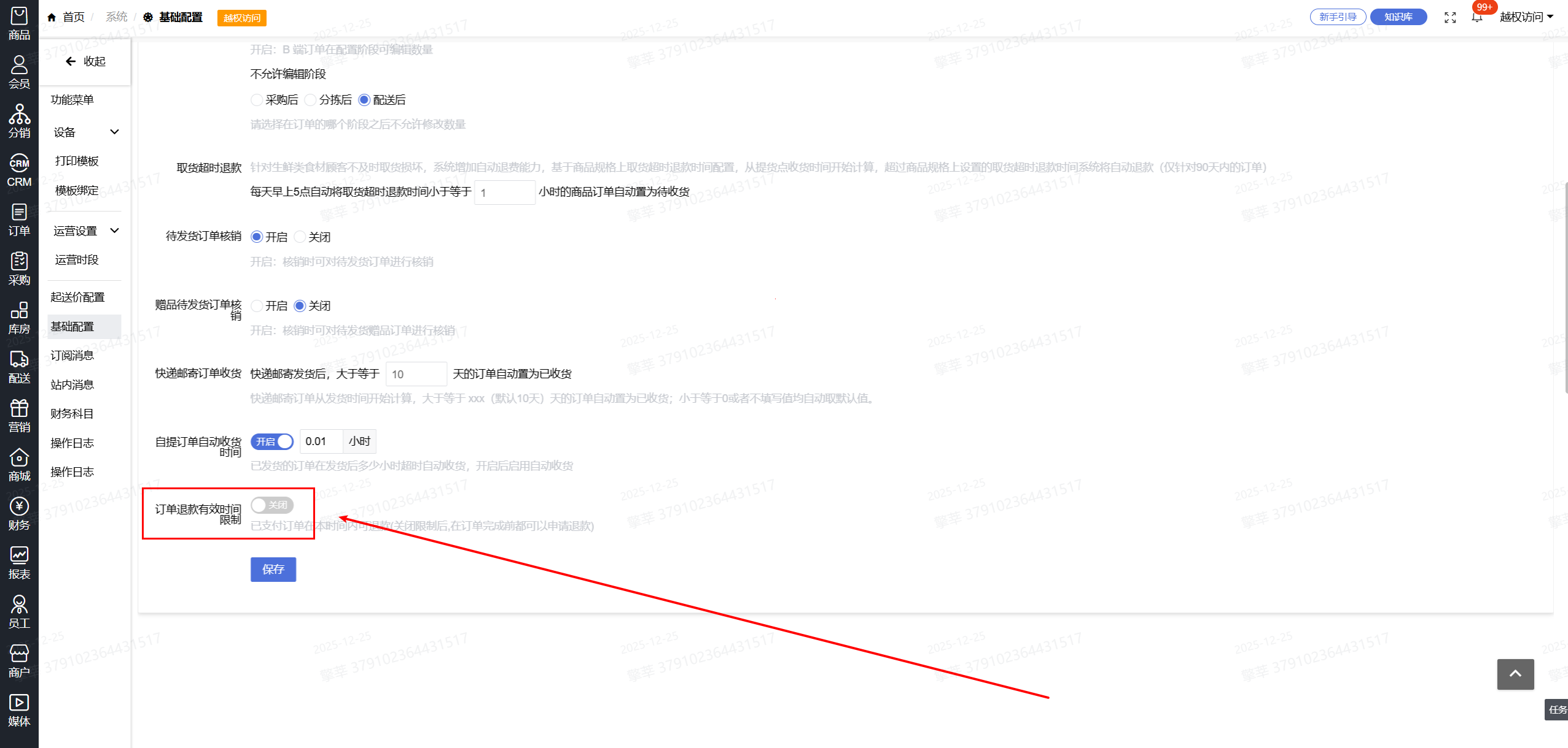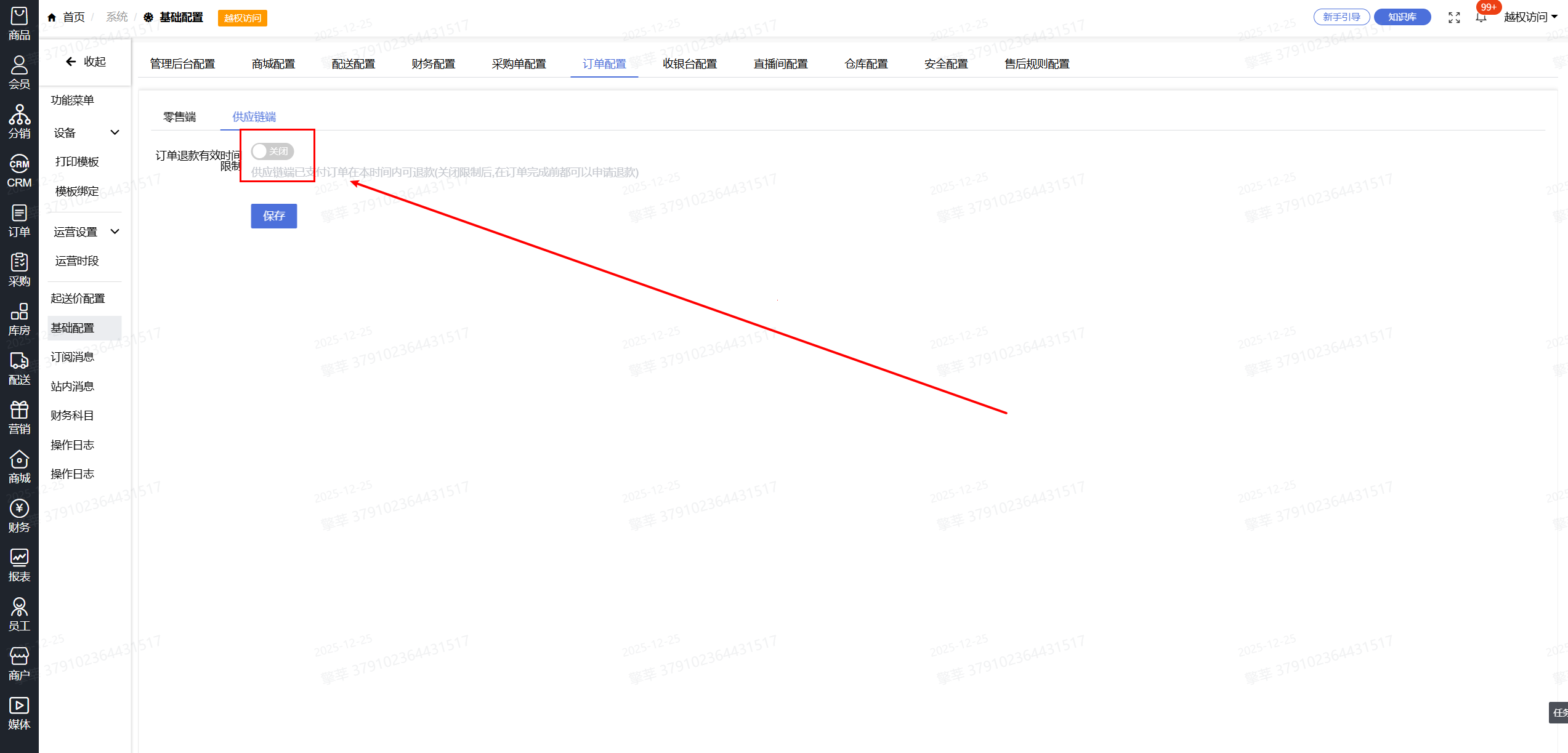 3.分别在订单配置-【零售端】和【供应链端】中的【订单退款有效时间】设置为【关闭】,点击保存