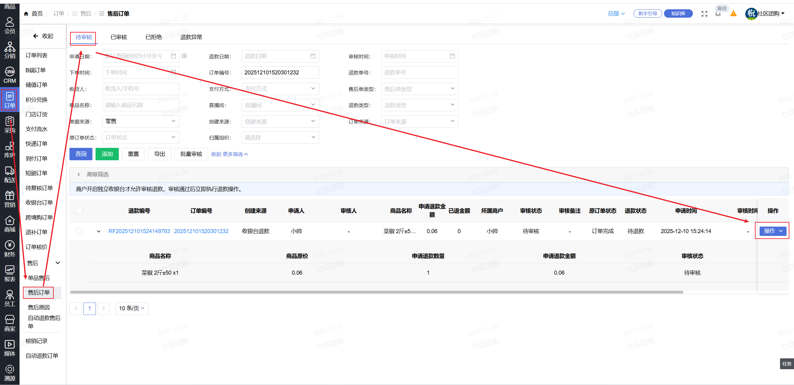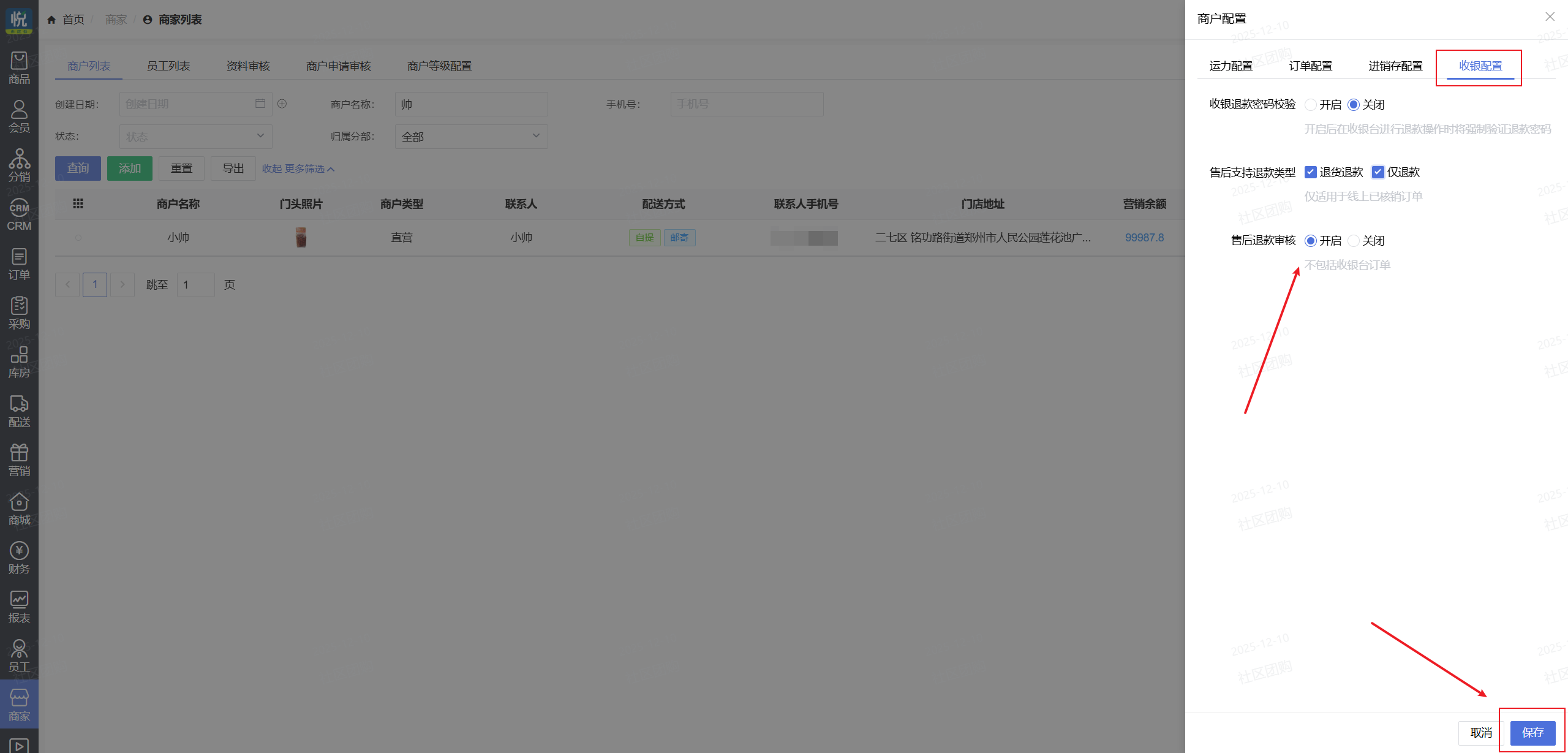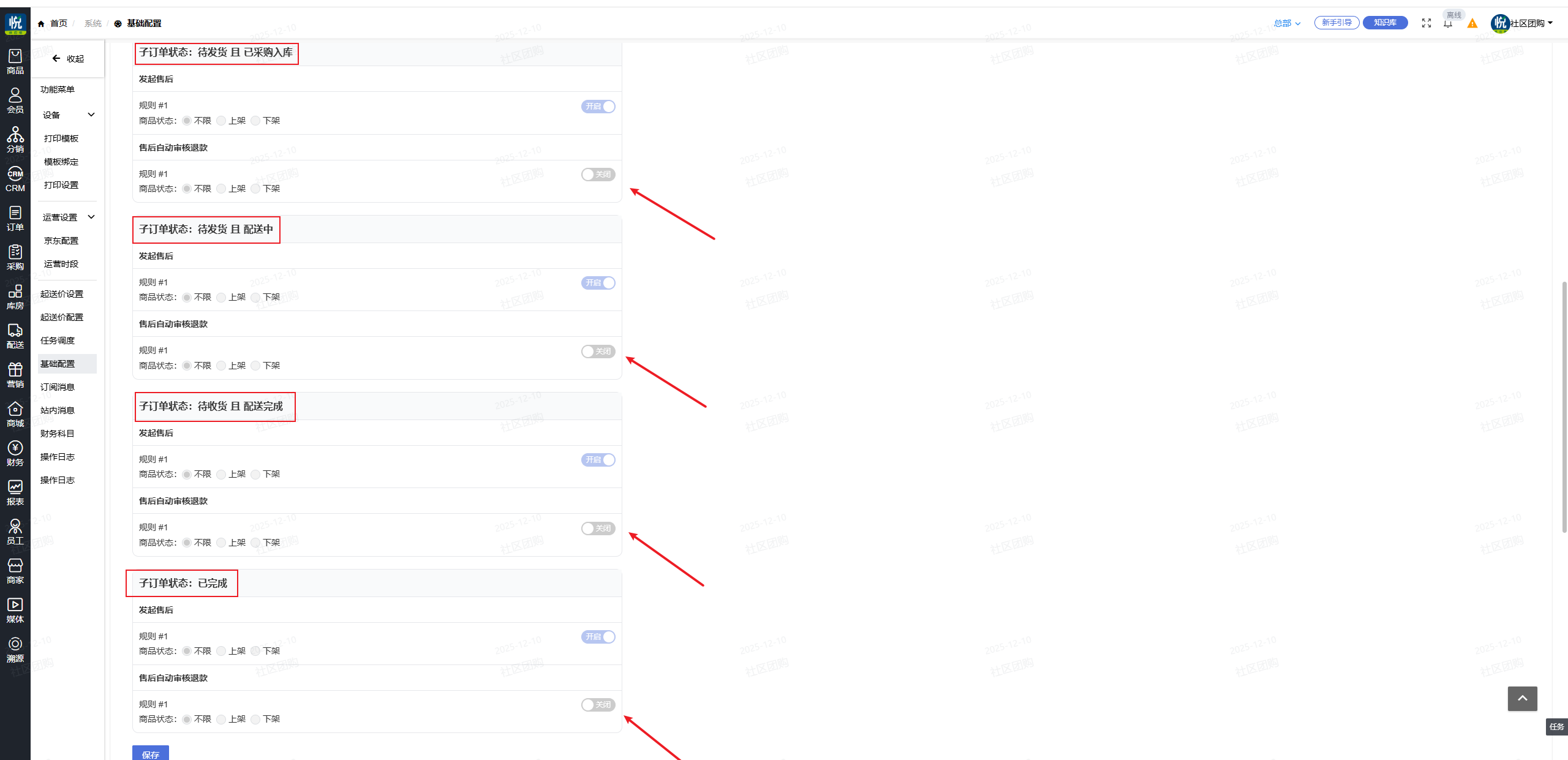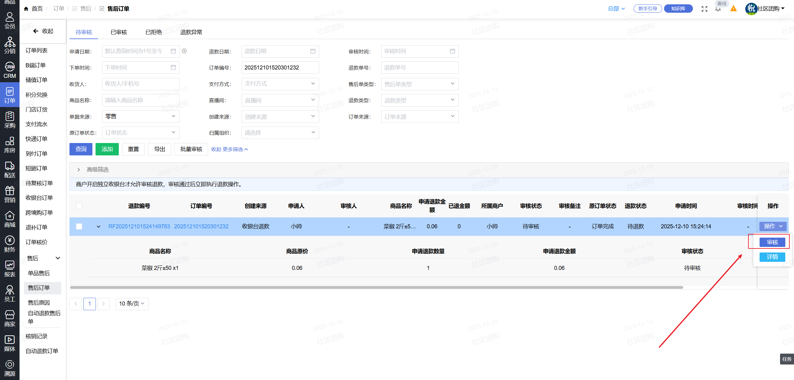 6.关闭售后自动审核退款,当订单处于:待发货 且 已采购入库,待发货 且 配送中,待收货 且 配送完成,已完成,这些状态的时候,默认允许收银台发起退款,收银台发起退款的订单需要在系统后台审核