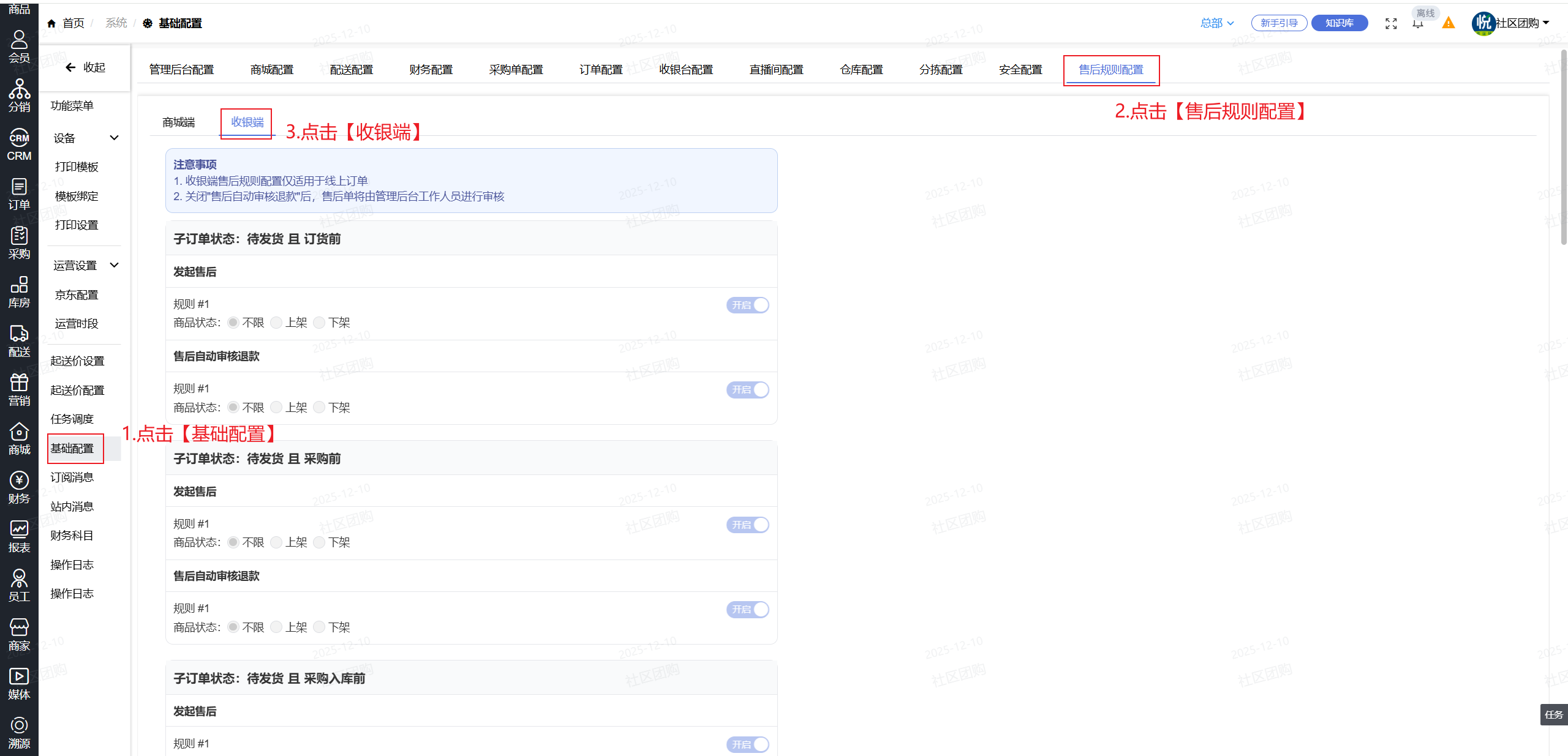 4.点击【基础配置】-【售后规则配置】-【收银端】