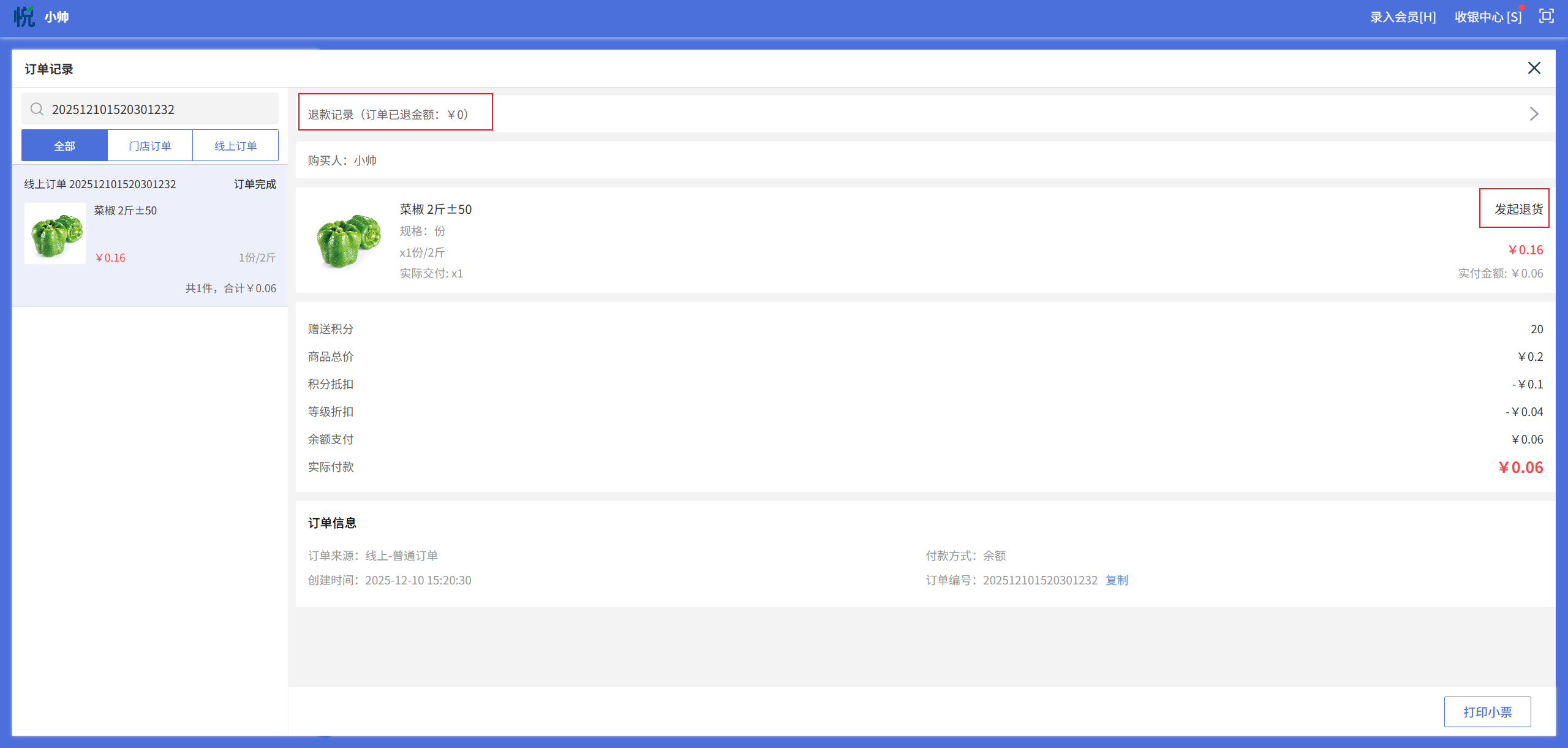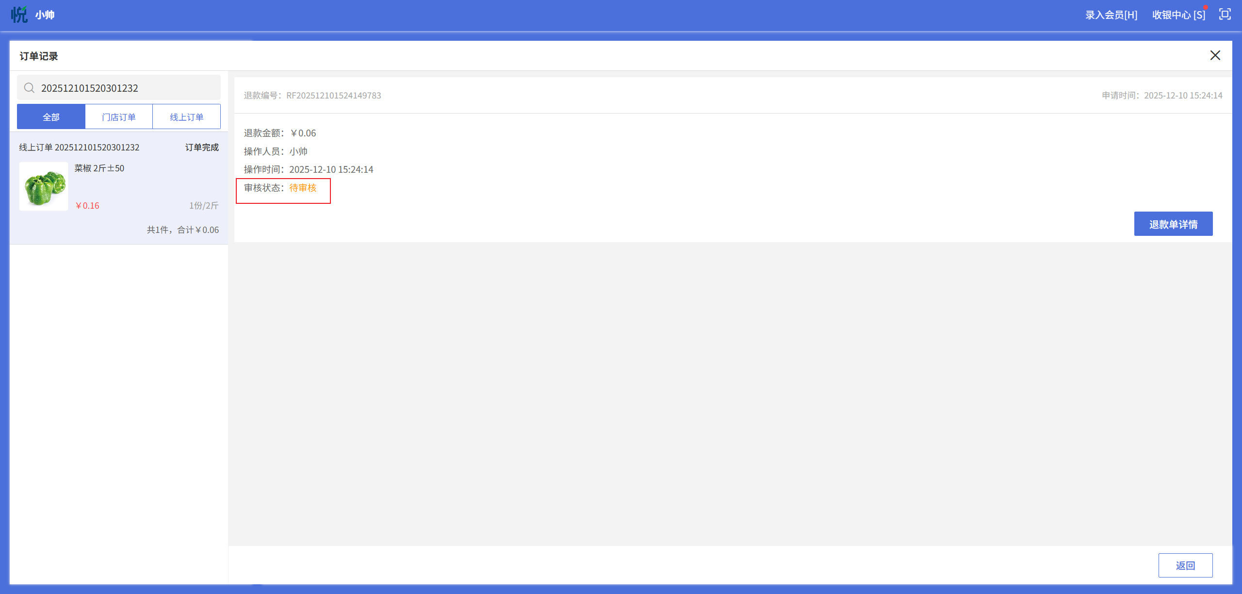 7.在收银台退款提示"发起退款",点击退款记录,审核状态:待审核