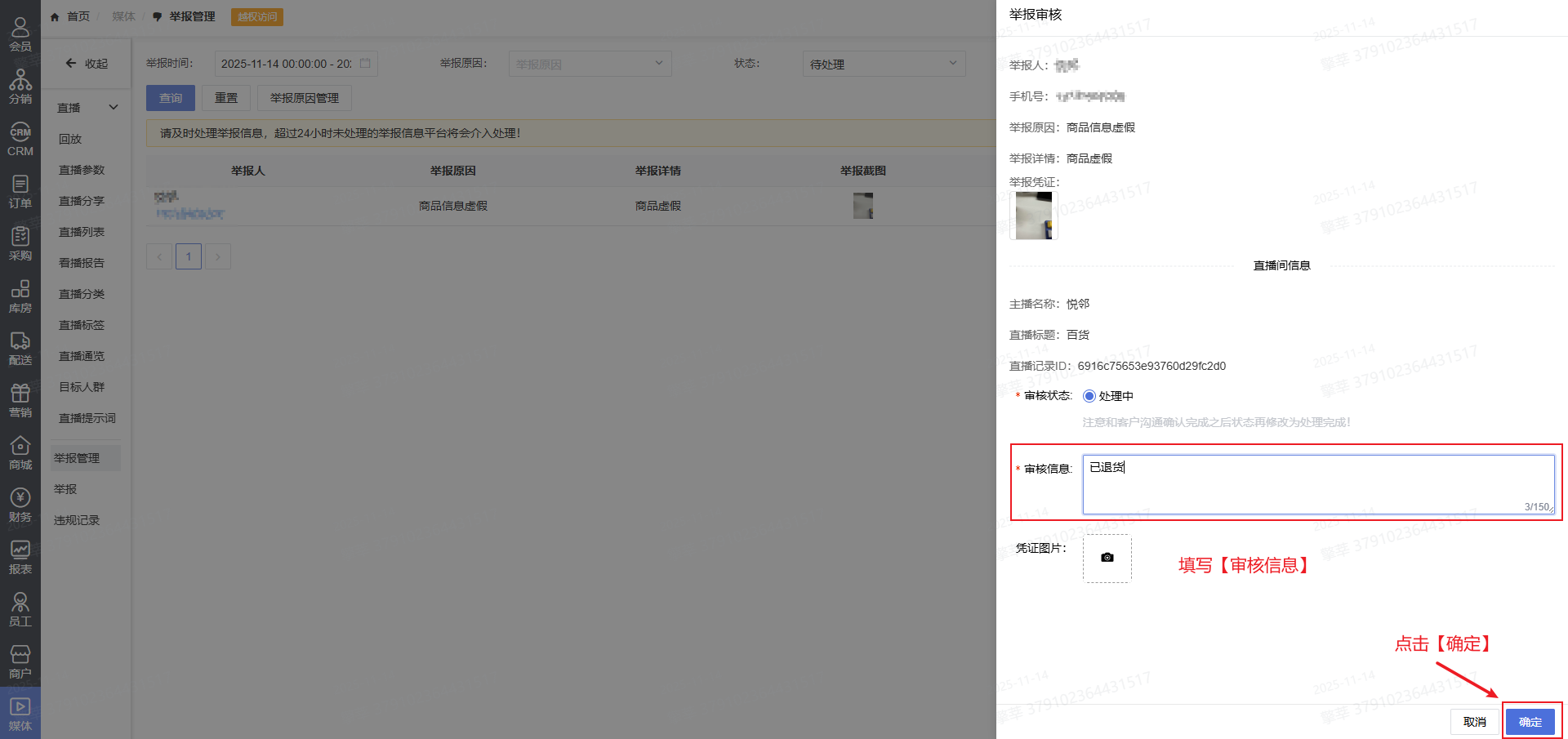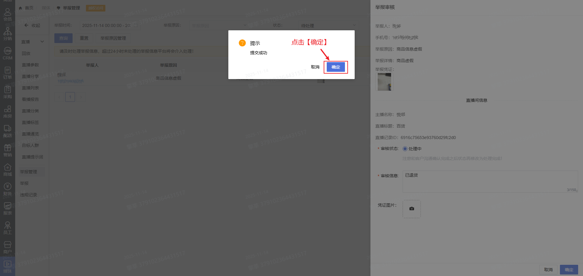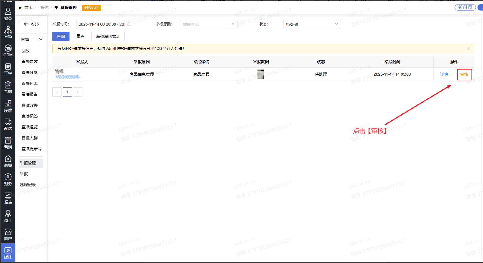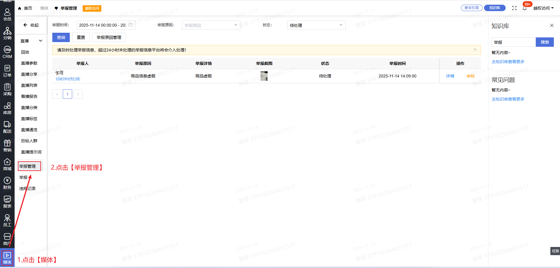 2.登录系统后台点击【媒体】-【举报管理】,查看举报信息