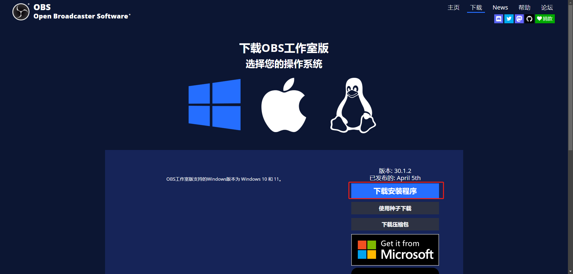 2、下载obs软件,官网下载即可下载,安装(如遇下载不了可在群里找产品人员要安装包)官网:https://obsproject.com/zh-cn/download
