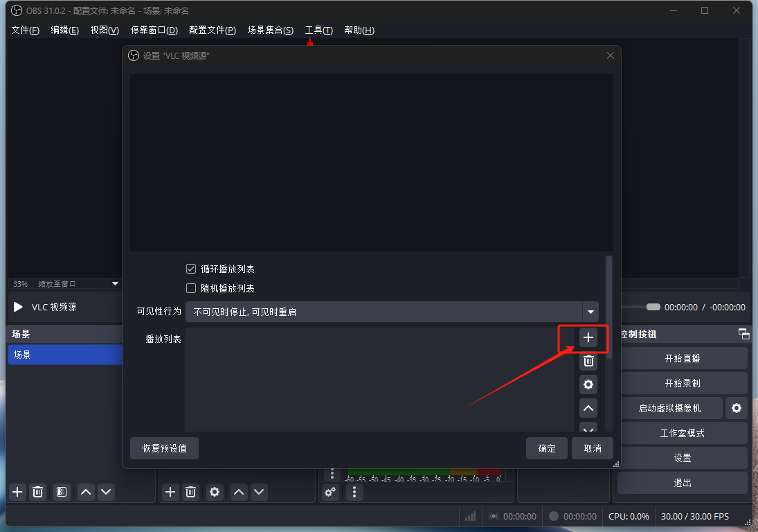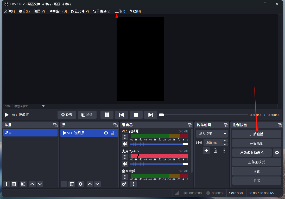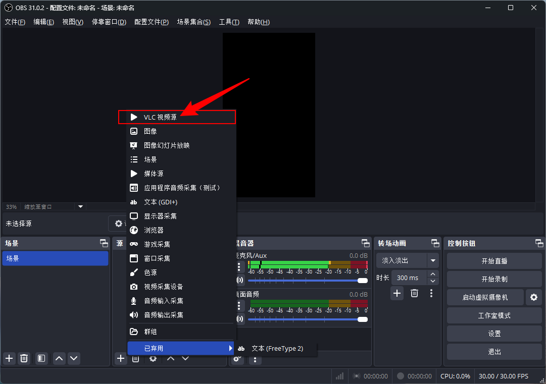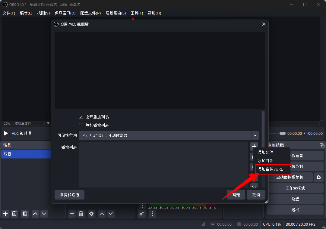 注意:如果obs已经下载,只安装VLC即可,安装完成之后,重启OBS