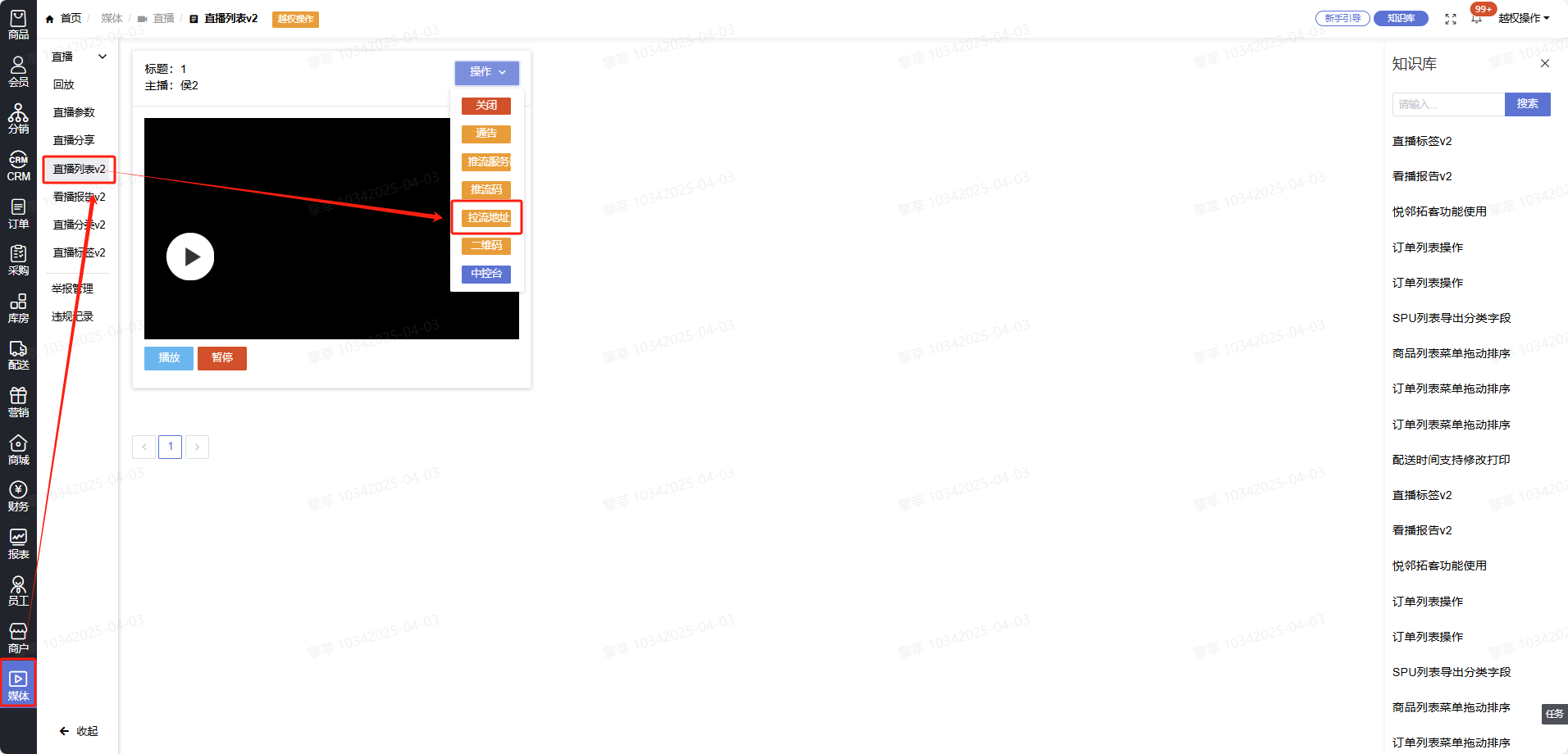 5、复制主直播间的拉流地址->管理后台->直播间列表->操作->复制拉流地址