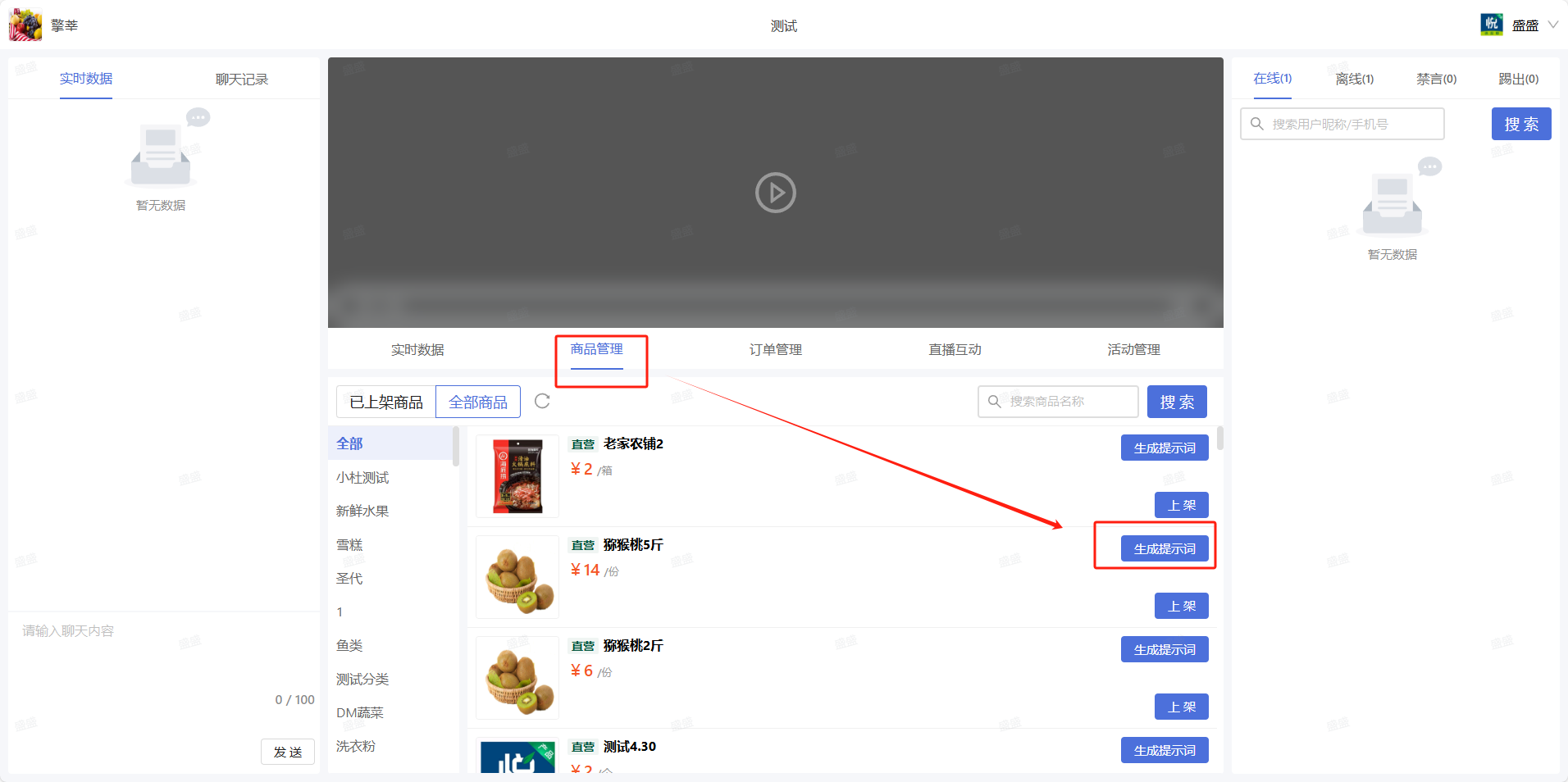 1. 可在系统后台,中控台中进行生成提示词;操作路径:后台—直播列表(看播报告)中进入中控台