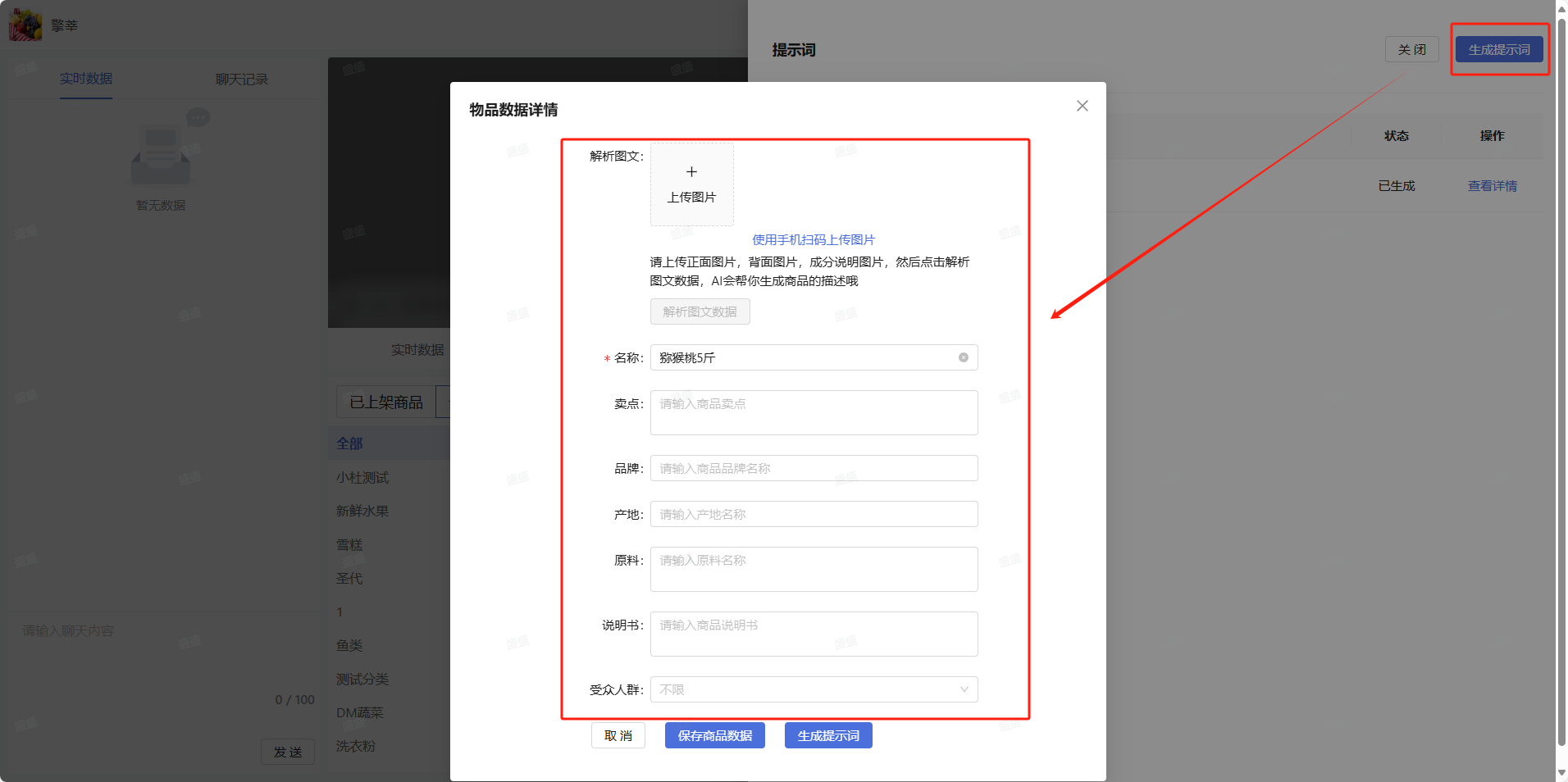 2. 进入中控台后,选择商品点击生成提示词,并且填写对应的信息,系统会自动根据信息生成提示词