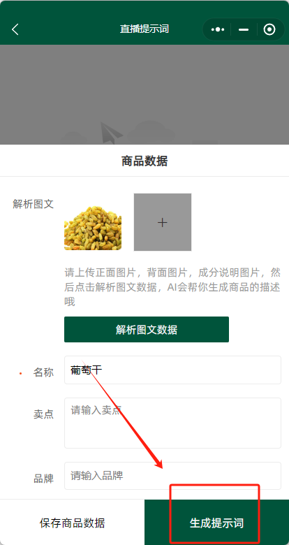 2. 选择商品后可输入相关信息,并生成提示词