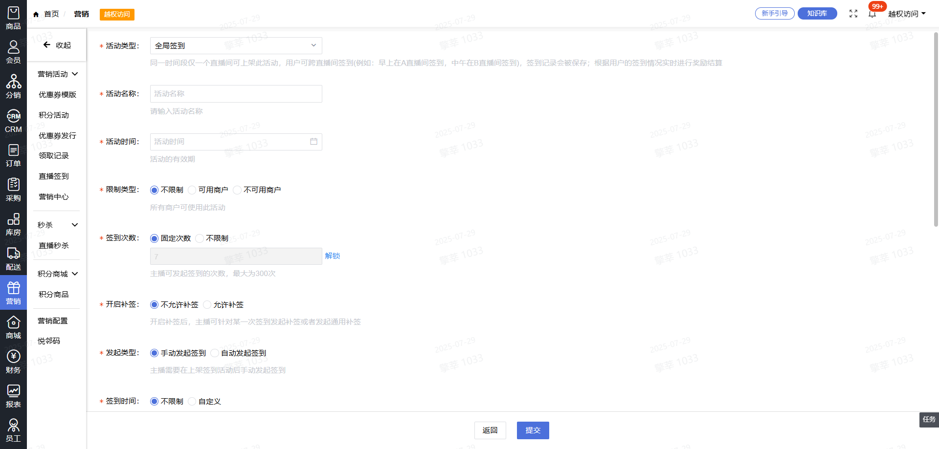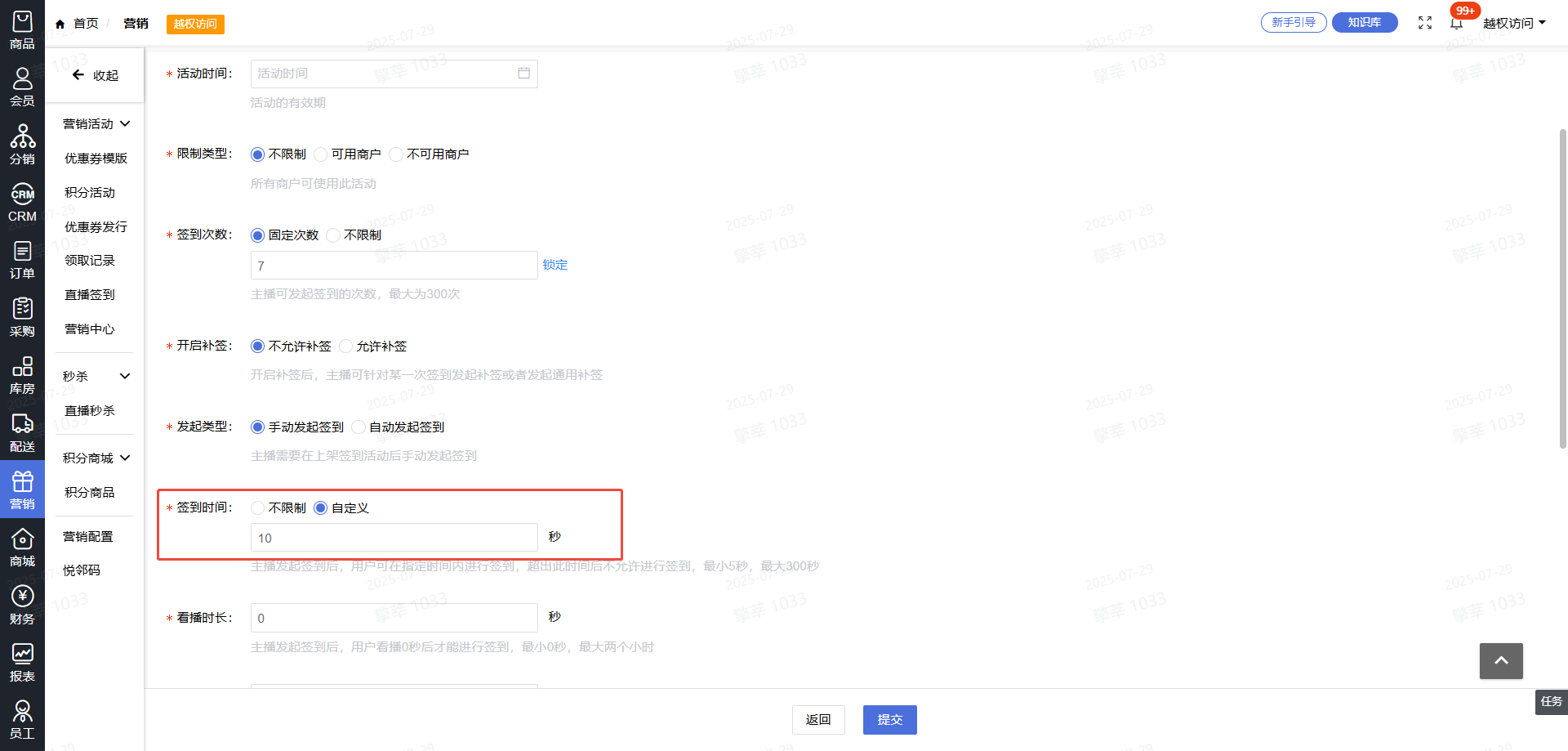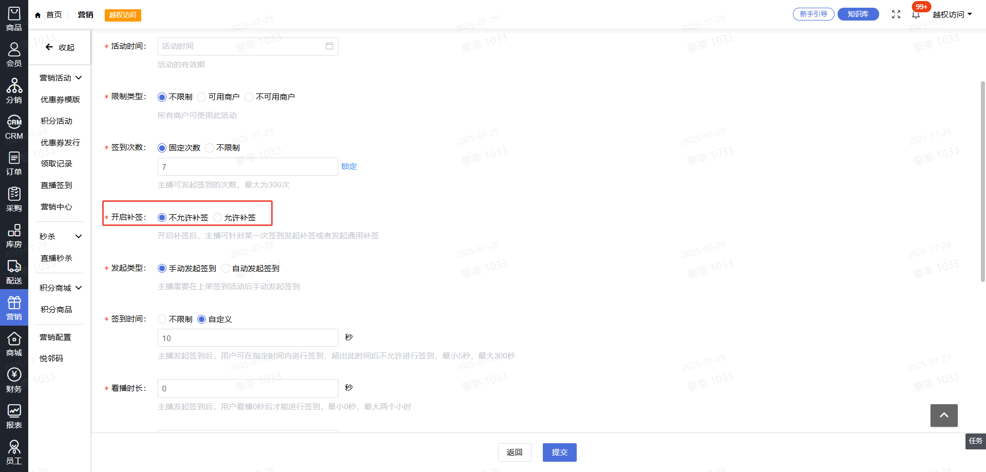 1.后台--营销--直播签到--全局签到