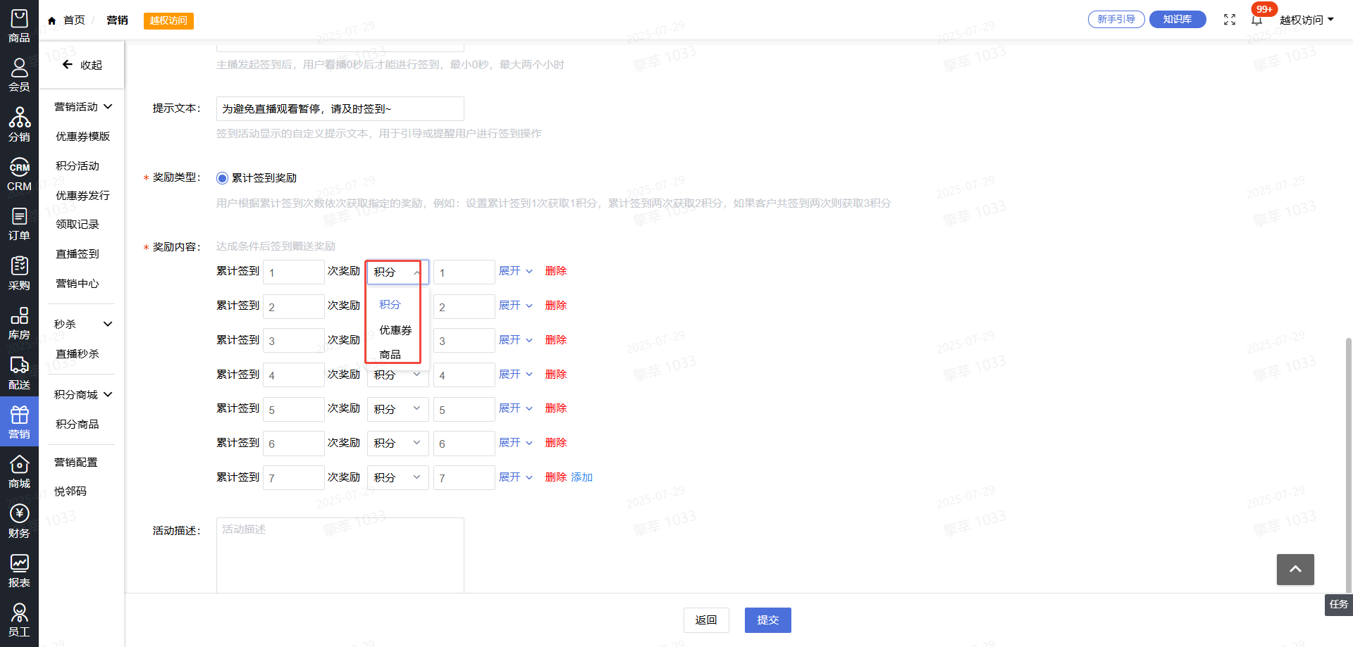 可发放奖励类型为:积分、优惠券、商品